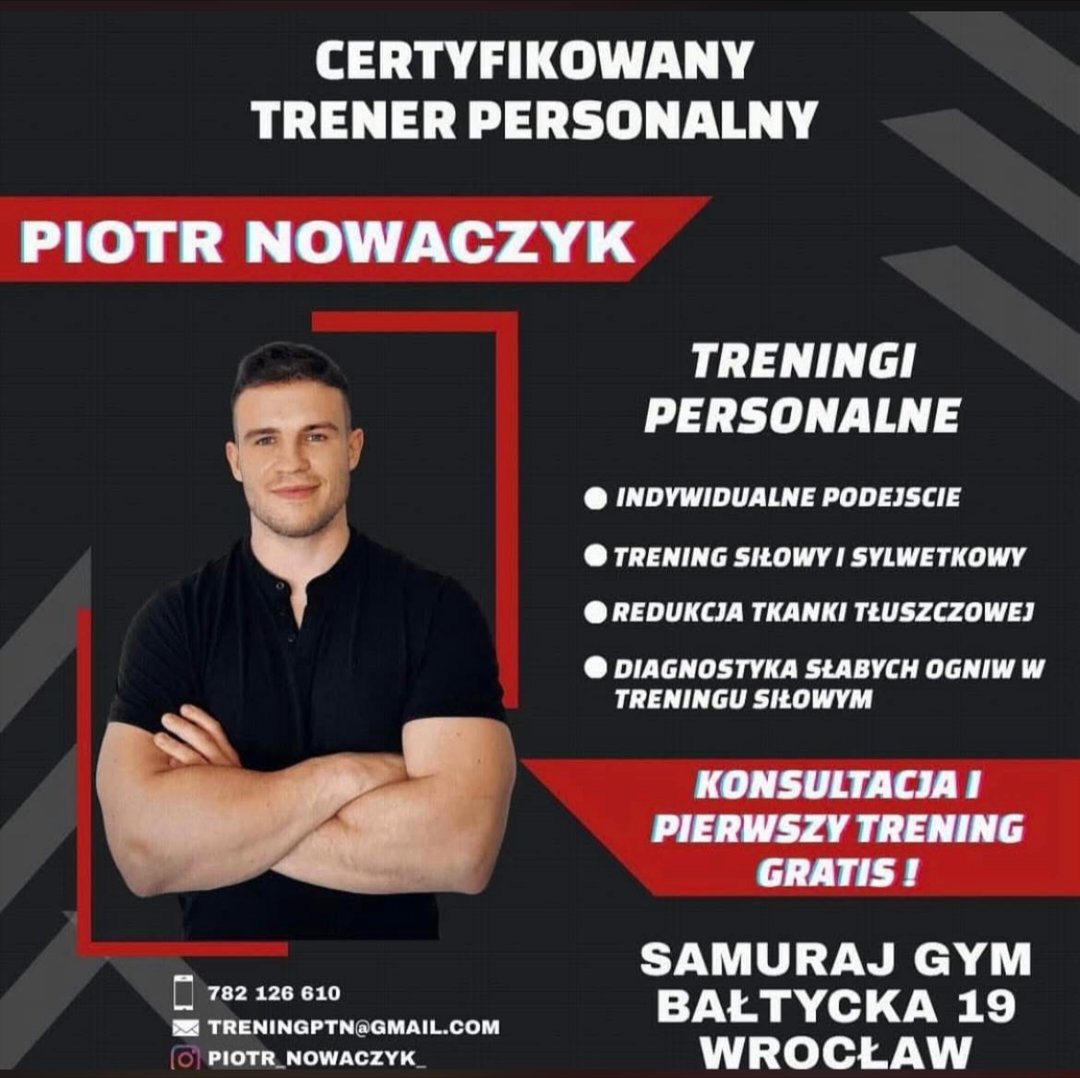 Jestem trenerem personalnym we Wrocławiu i pomagam osobom początkującym oraz wracającym do formy schudnąć, poprawić sylwetkę i zbudować siłę bez chaosu treningowego. Specjalizuję się w treningu siłowym oraz redukcji tkanki tłuszczowej. Prowadzę treningi personalne we Wrocławiu Każdy plan jest dopasowany do możliwości, zdrowia i trybu życia klienta. Zajęcia odbywają się w klubie SAMURAJ GYM ul. Bałtycka 19 we Wrocławiu. Oferuję również : - pakiety treningowe - plany treningowe